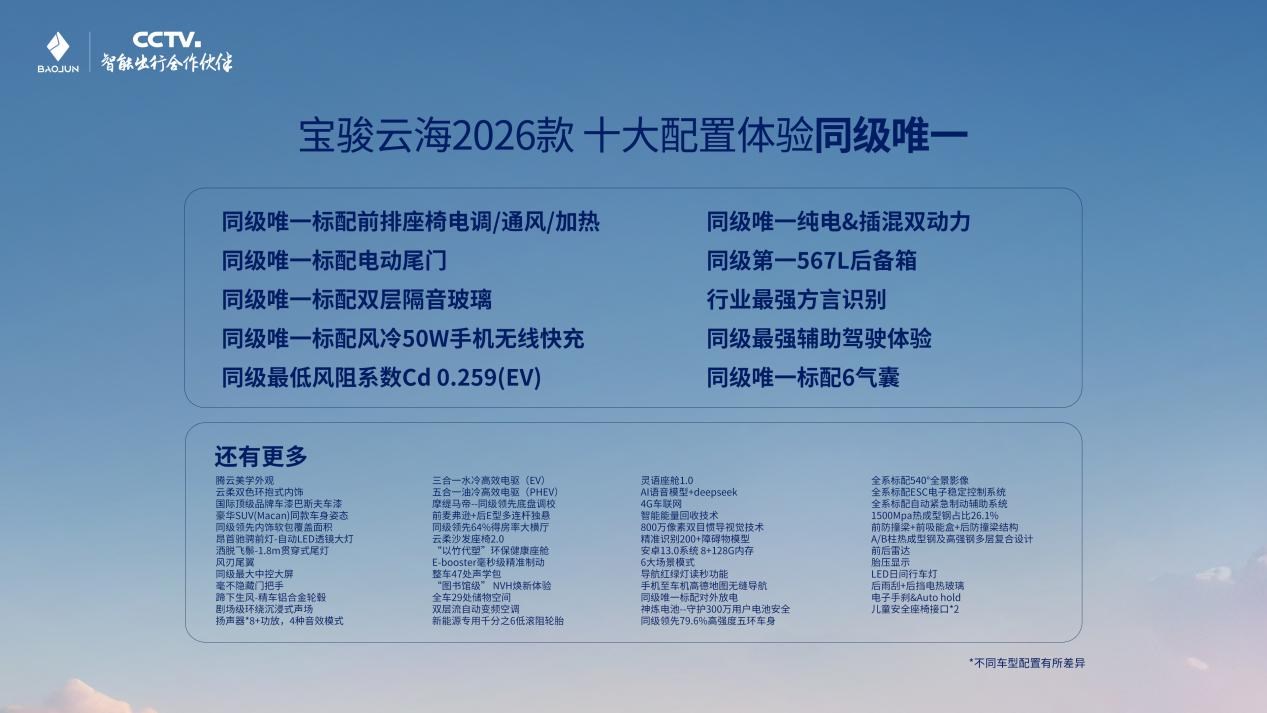 9月13日,“龔赴云海 與JUN同行——寶駿云海私享會(huì)”圓滿落幕。此次,寶駿汽車攜手全球品牌代言人龔俊,共同解讀寶駿云海2026款及俊雅版的產(chǎn)品硬實(shí)力。同時(shí),正式公布了分階段推進(jìn)的OTA升級(jí)計(jì)劃,10月31日前將為旗下五款車型陸續(xù)推送最新靈語座艙體驗(yàn),并將在今年年底行業(yè)首發(fā)10萬級(jí)城市領(lǐng)航輔助功能,讓老車主也能擁有“常用常新”的智能體驗(yàn)。