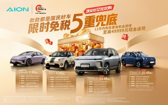 新能源領(lǐng)軍企業(yè)廣汽埃安,率先啟動“埃安雙12狂歡購”,以高品質(zhì)國民好車,疊加行業(yè)首個“限時免稅5重兜底”,為消費(fèi)者送上“定心丸”。不僅承諾購置稅兜底、提供豐厚禮包,更有購車搶至高49999元現(xiàn)金返現(xiàn)超級福利,堪稱年末不容錯過的“抄底”良機(jī),讓家庭用戶省錢省心把愛車開回家。
